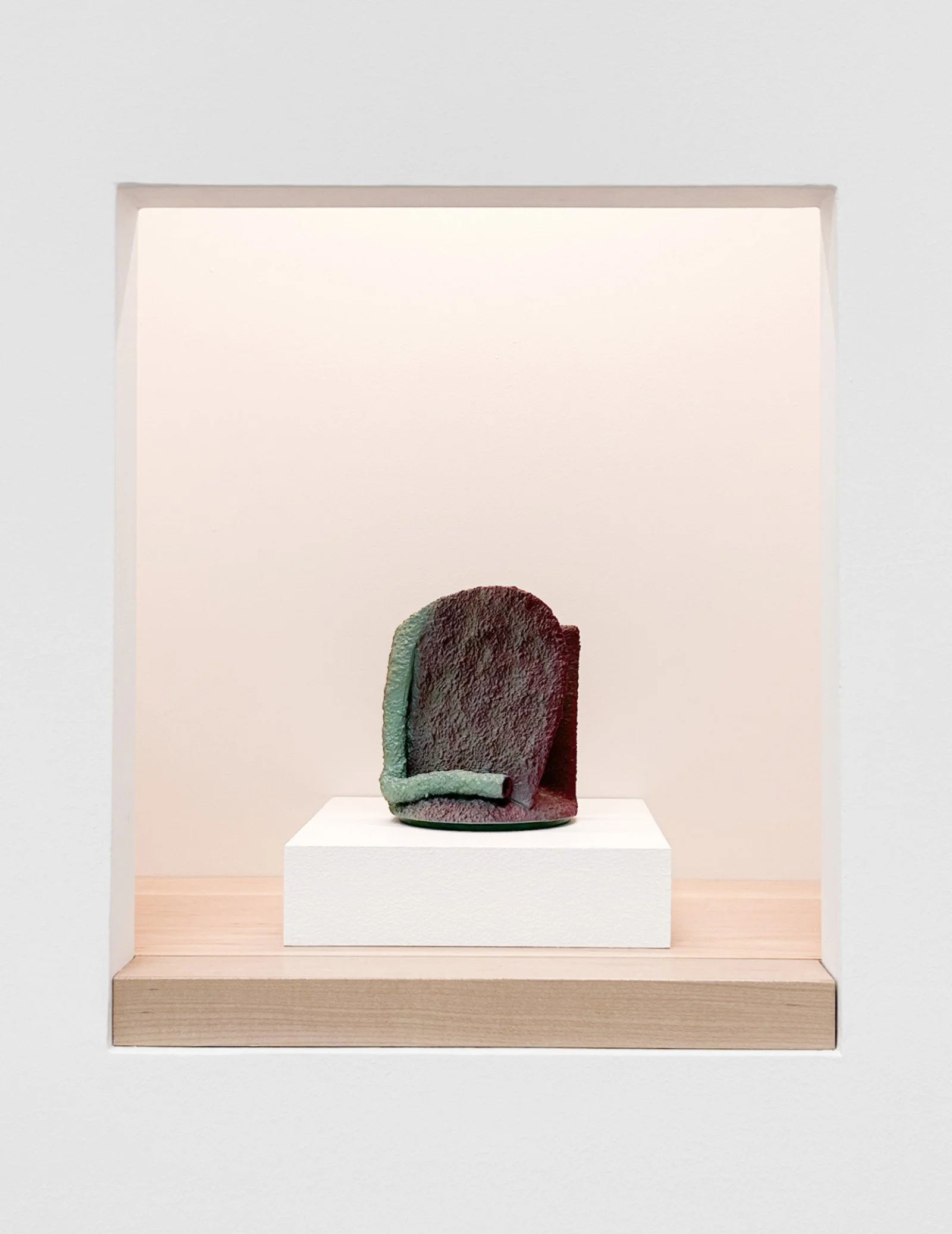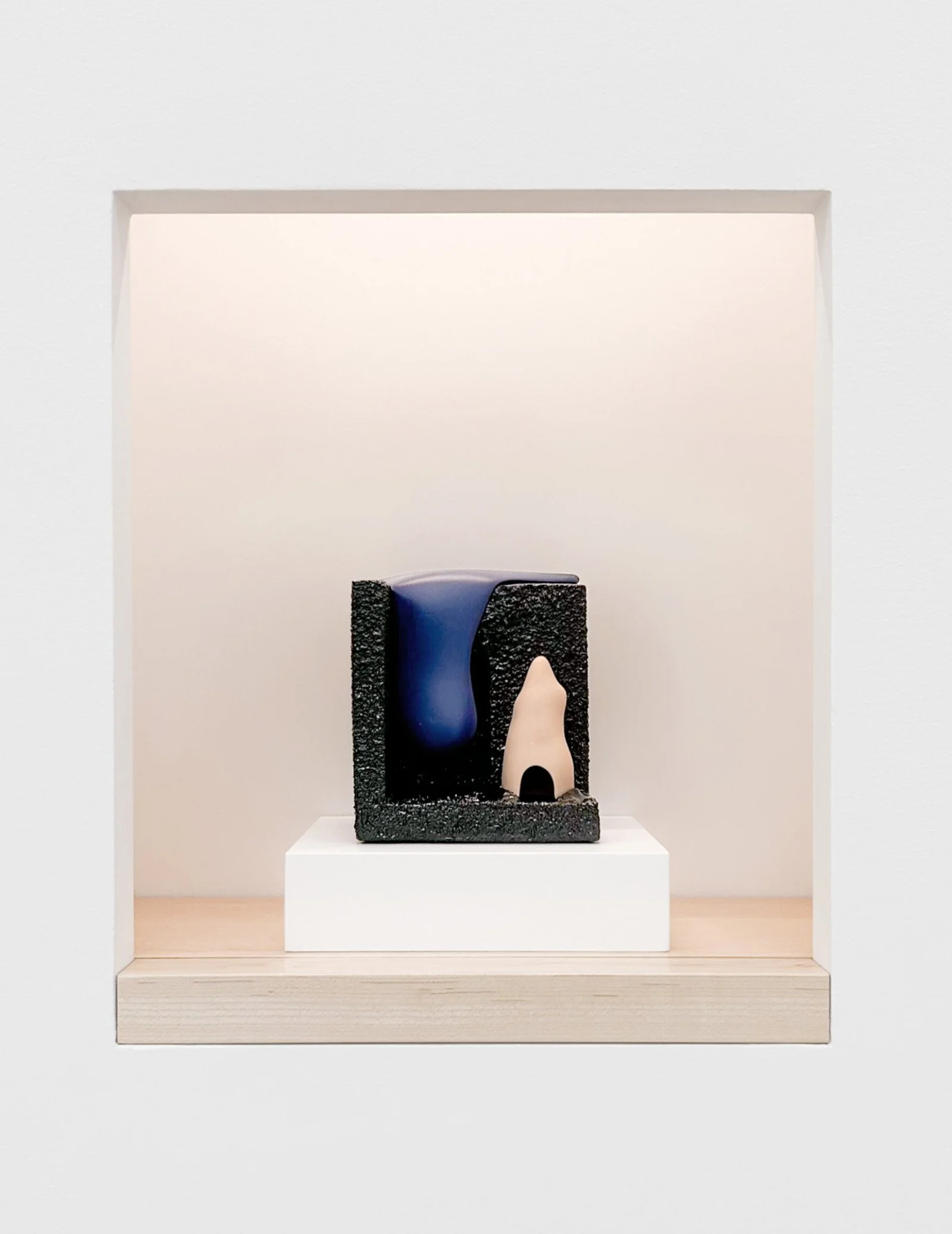The sculptures, each no larger than six-and-a-half inches in any dimension, are made by hand in the artist’s San Francisco studio using a combination of traditional mediums, such as porcelain and ceramic, and more contemporary materials, like catalyzed polyurethane and epoxy resin. Nagle has spoken of the “immediacy” of clay, while critics have noted the wealth of “beguiling effects” offered by his less conventional materials. Color is as important as form for Nagle, who has often described his sculptures as three-dimensional paintings. Like still lives or miniature stage sets, the works evoke both landscapes and interiors. As Nagle has said, “they’ve got sort of this inside/outside quality. I always like the mystery of looking inside something in this kind of intimate observation, where you can see what’s going on, but then there’s also something beyond.”
