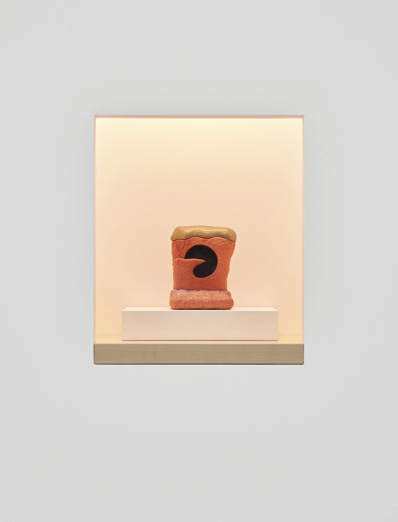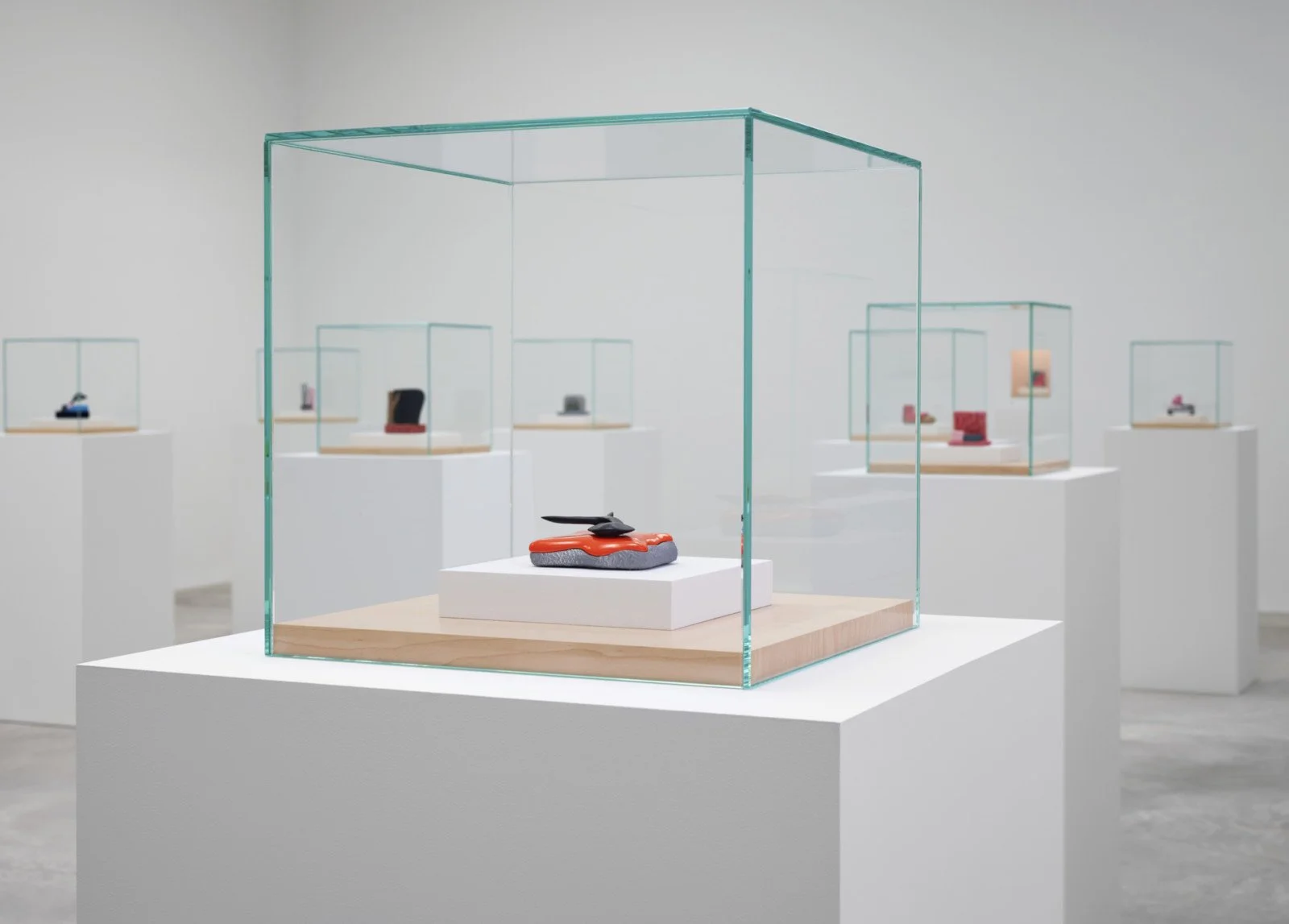 The sculptures, all from 2016, are presented in niches and glass vitrines designed in collaboration with the artist. The vitrines display sculptures with titles such as Historical Land Mind and Sandmandia, which are meant to be seen from above or in the round, while the niches present several works, including Elusive Combinations and Glorious Assemblage, whose branch-like forms and scroll-like bases evoke the art of bonsai. Although several sculptures employ crackle glaze and other nods to traditional pottery, the works in this exhibition are notable for the wide range of effects achieved with such contemporary materials as epoxy resin, catalyzed polyurethane, and high-gloss automotive paint mixed to the artist’s specifications and applied with an airbrush.